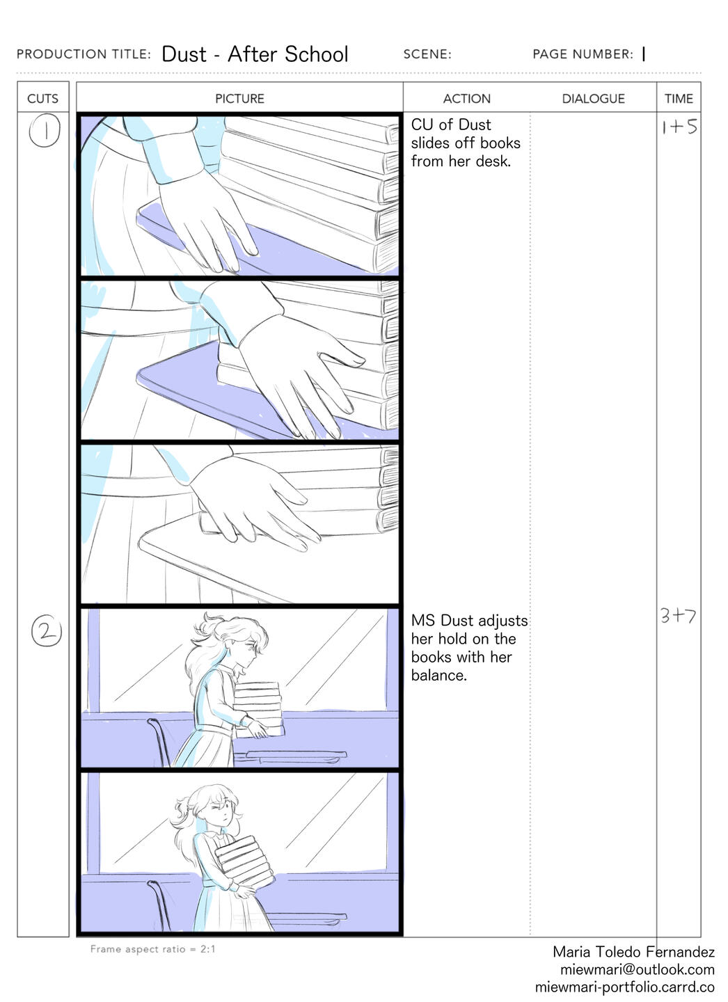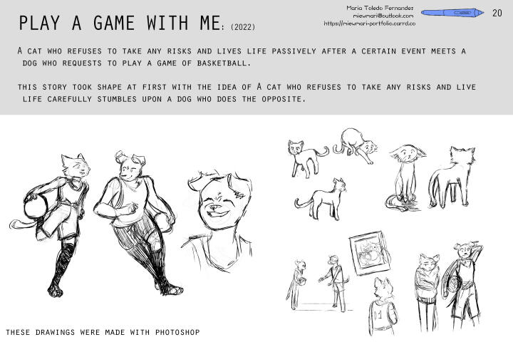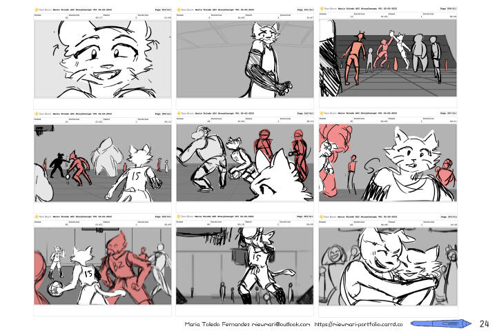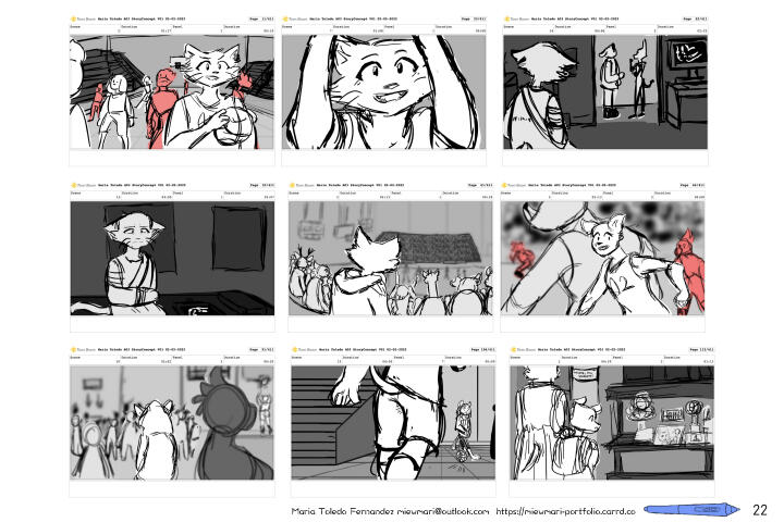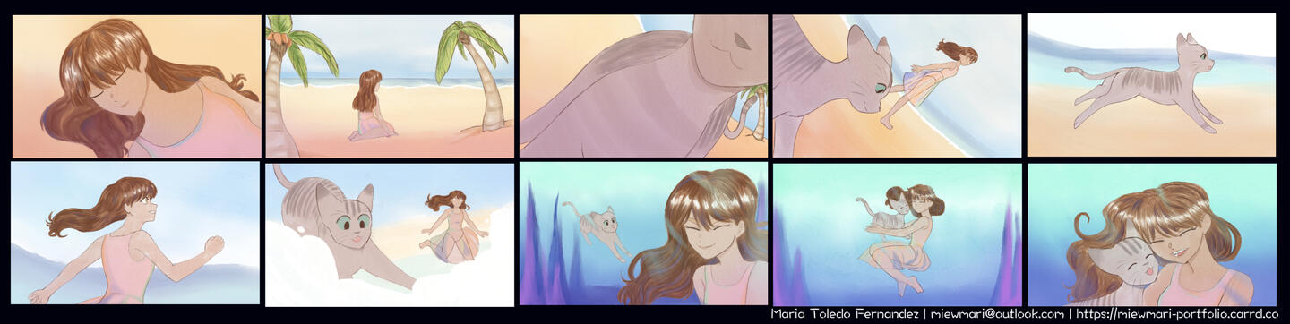 My name is Maria Toledo Fernandez and I am a story artist based in Ponce, Puerto Rico!I graduated from Savannah College of Art and Design with a BFA in Animation with a concentration on storytelling and concept development.My work includes storyboarding, concept design, illustration and comics! On the side, I am working on improving my 2d animation skills and modeling on blender to use as reference for my work.In my free time, I am either catching up with some anime and video games or at the beach reading manga! I have a small online shop "Gatitos by Mari" where I make cute products with colorful and sweet cats. Via the background I am also developing a to-be-announced webtoon.